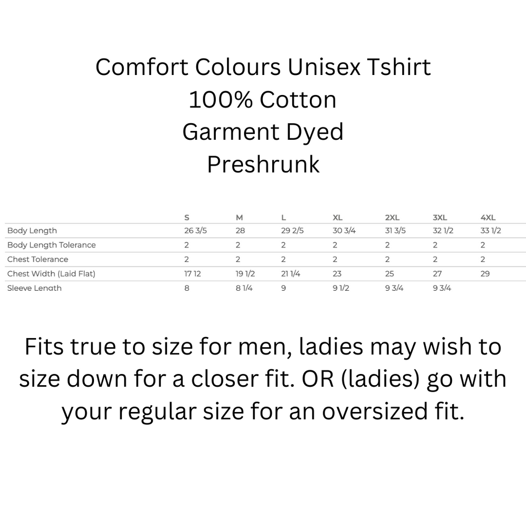 T-shirts are Comfort Colours 100% cotton, garment dyed for a softer feel